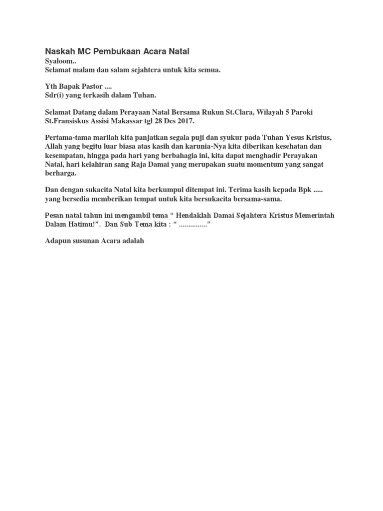 Kata sambutan pembukaan acara natal berita terbaru hari ini. Selamat datang dalam perayaan natal bersama jemaat gmim nafiri malalayang kolom 11. Kata kata pembukaan mc ibadah natal kata pembuka oleh mc 2. Naskah mc pembukaan acara natal.docx. Kata sambutan mc natal berita terbaru hari ini tata ibadah natal .